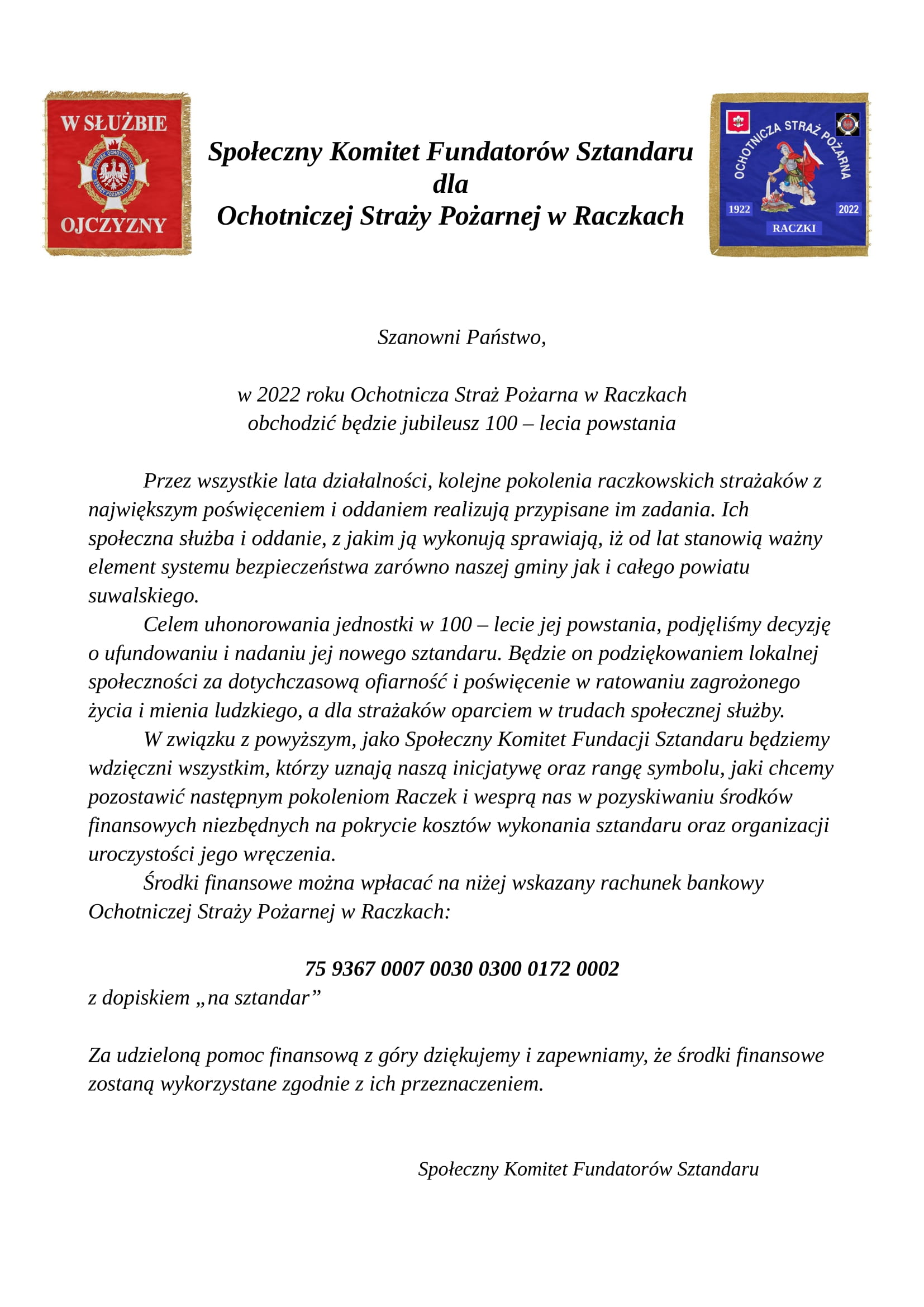 Opublikowano 2022-02-18 Prośba o wsparcie zakupu sztandaru – OSP Raczki |Pi Pismo do pobrania- Pismo z prośbą o wsparcie OSP Raczki Nawigacja wpisuPoprzedni wpis: Ogólnopolski Turniej Wiedzy Pożarniczej „Młodzież Zapobiega Pożarom”Następny wpis: Pomoc dla wojennych uchodźców z Ukrainy