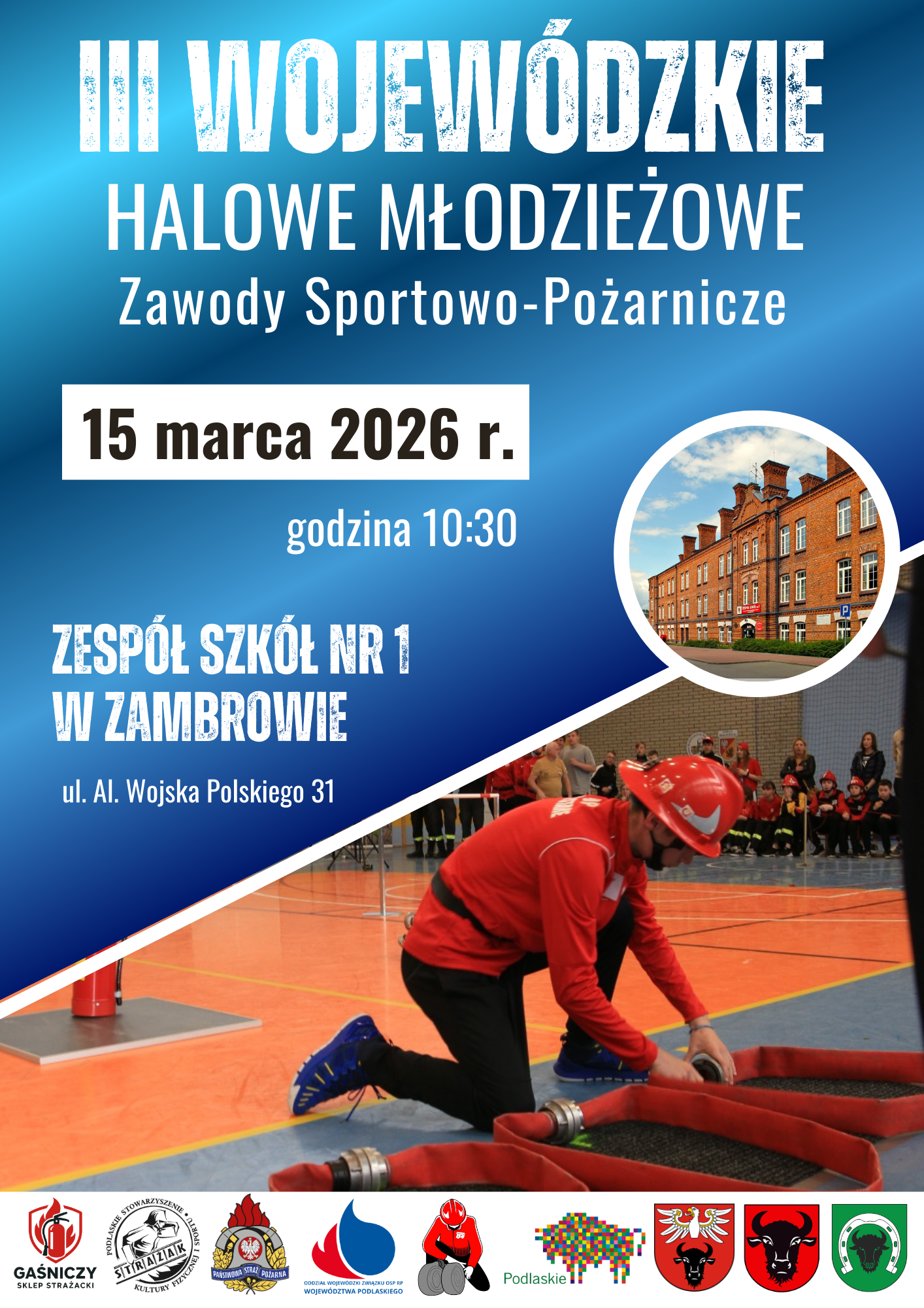 Już 15 marca 2026 r. w Zespole Szkół nr 1 im. gen. Stefana Roweckiego „Grota” w Zambrowie (ul. Wojska Polskiego 31) odbędą się III Wojewódzkie Halowe Młodzieżowe Zawody Sportowo-Pożarnicze