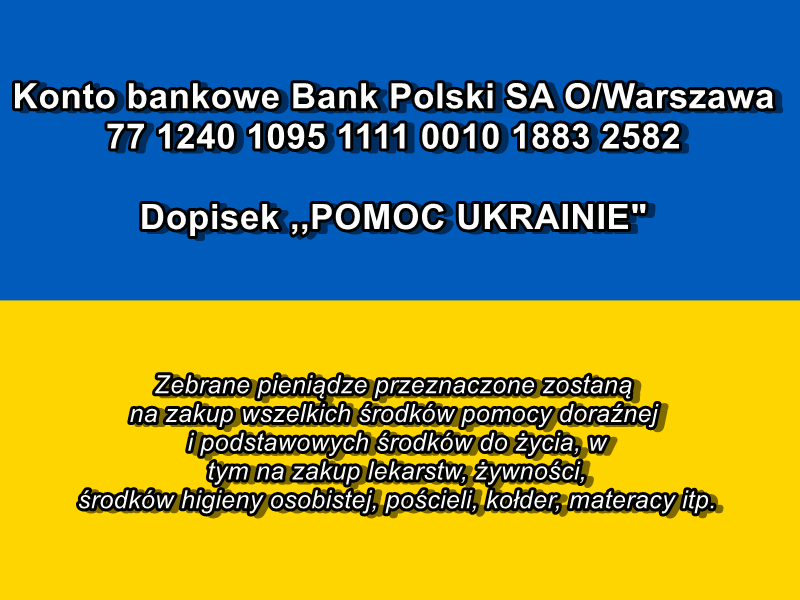 Uruchomiliśmy specjalne konto bankowe, na które można dokonywać wpłat pieniężnych z dopiskiem „POMOC UKRAINIE”.