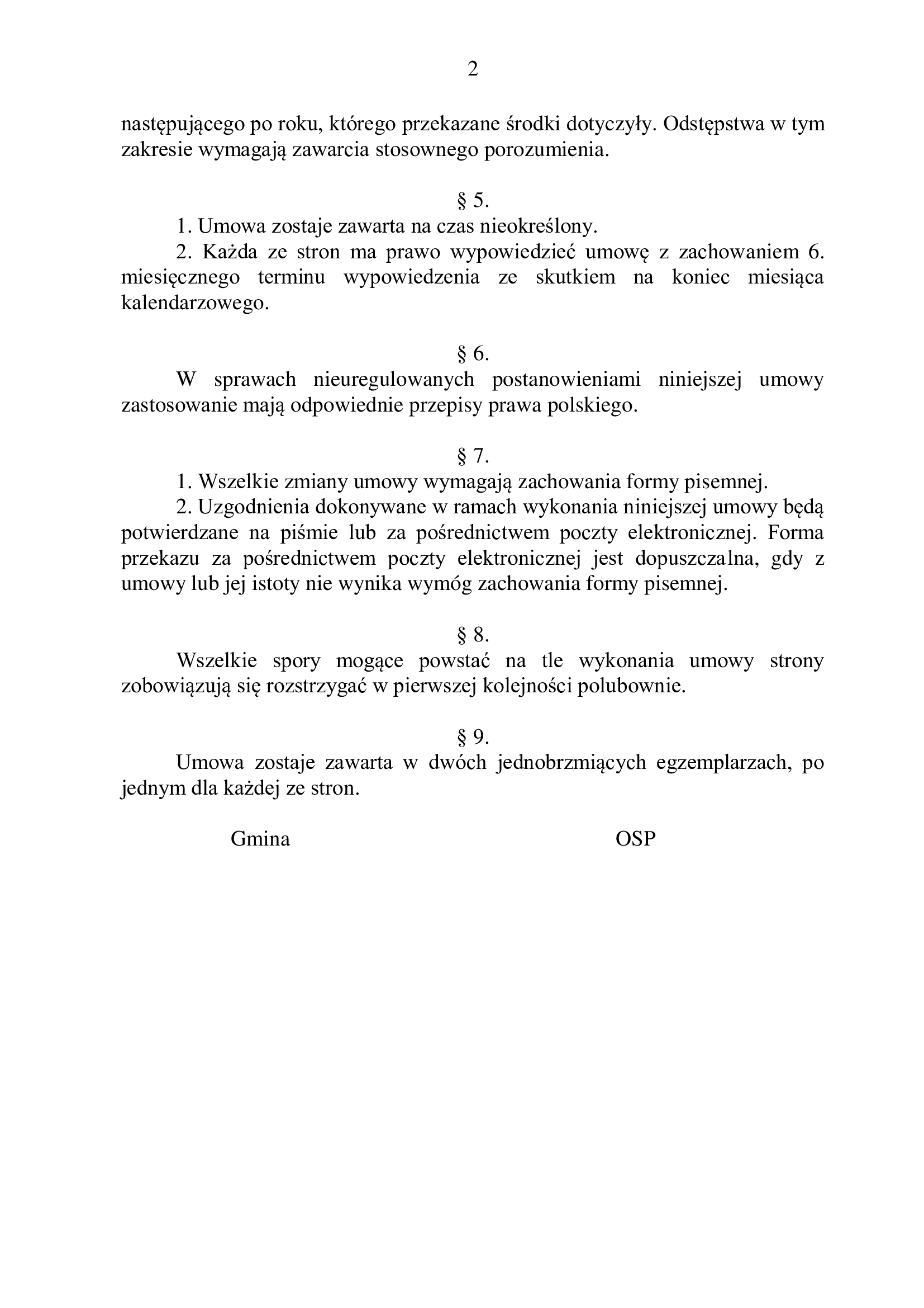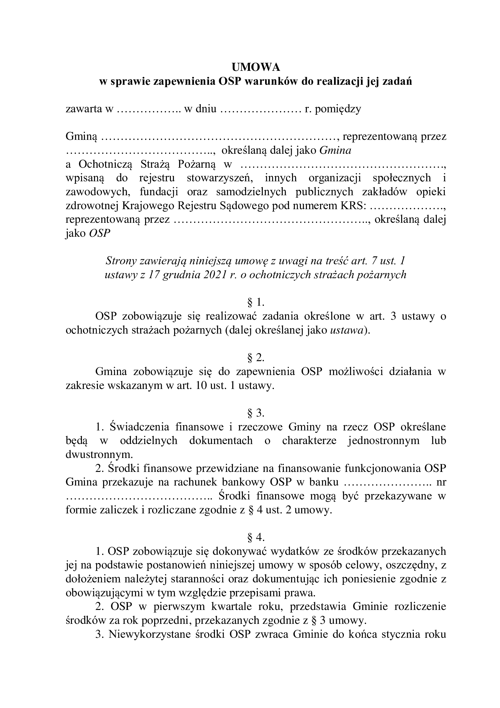Załączamy projekt Umowy pomiędzy Gminą a OSP w sprawie zapewnienia OSP warunków do realizacji jej zadań.